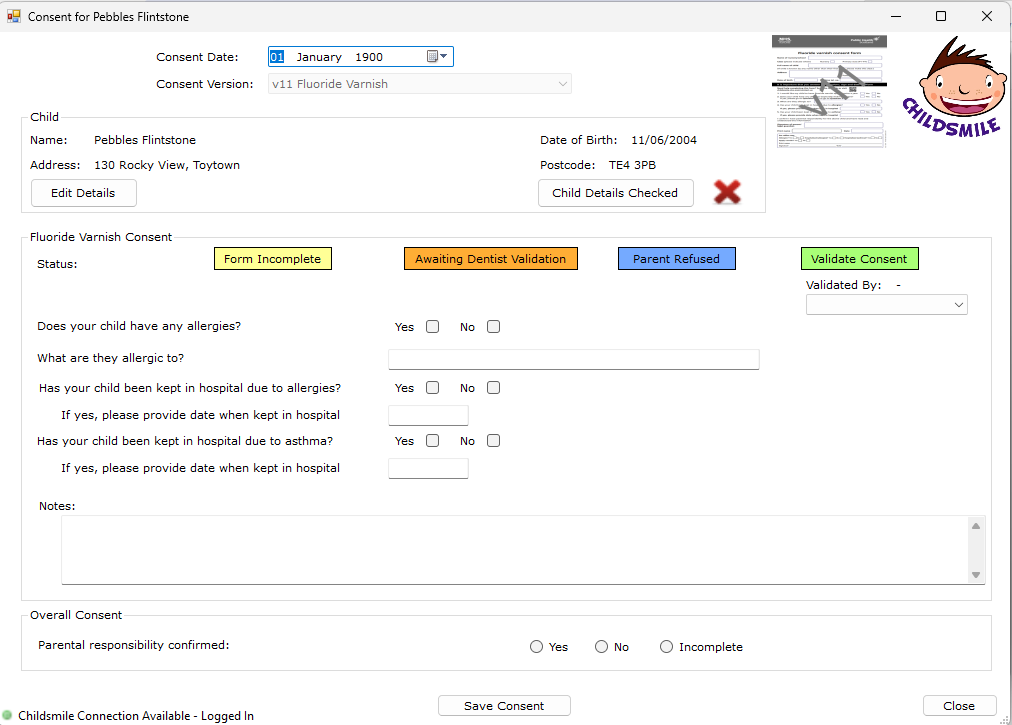 * A valid consent date is important for reporting the progress of the Childsmile programme. The consent date must be accurately recorded from the consent form as the date the parent / guardian signed the form, not the date the information is entered into the system. To ensure high quality data it is important that consent dates are recorded accurately.